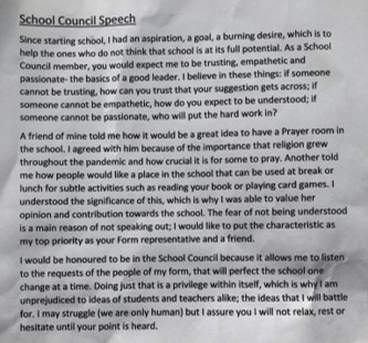 “As a School Council member, you would expect me to be trusting, empathetic and passionate – the basics of a good leader.” Year 9 Student & School Council applicant